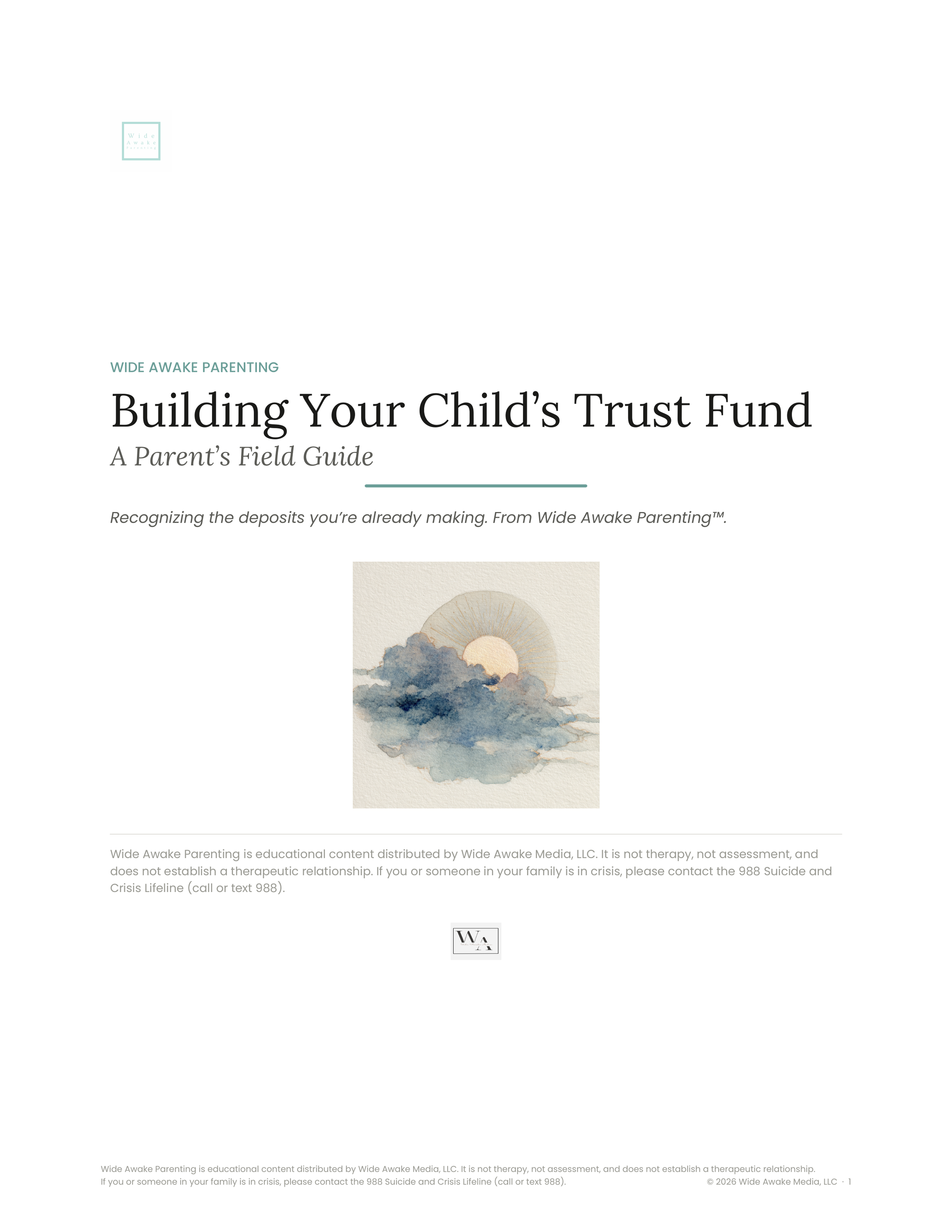 Not a financial one — an emotional one. The listening, the repair, the showing up even when it's hard. Research in neuroscience and attachment tells us these moments build something real: your child's deep sense of safety, connection, and self-worth. Wide Awake Parenting helps you see the deposits you're already making — and make more of them on purpose.